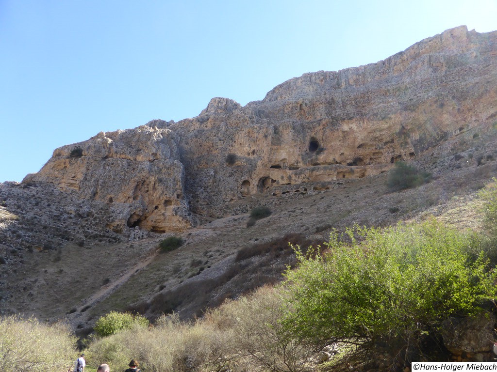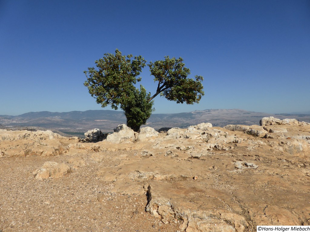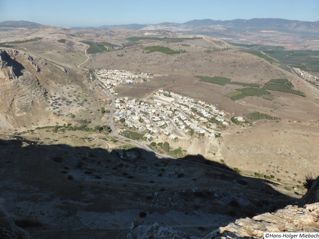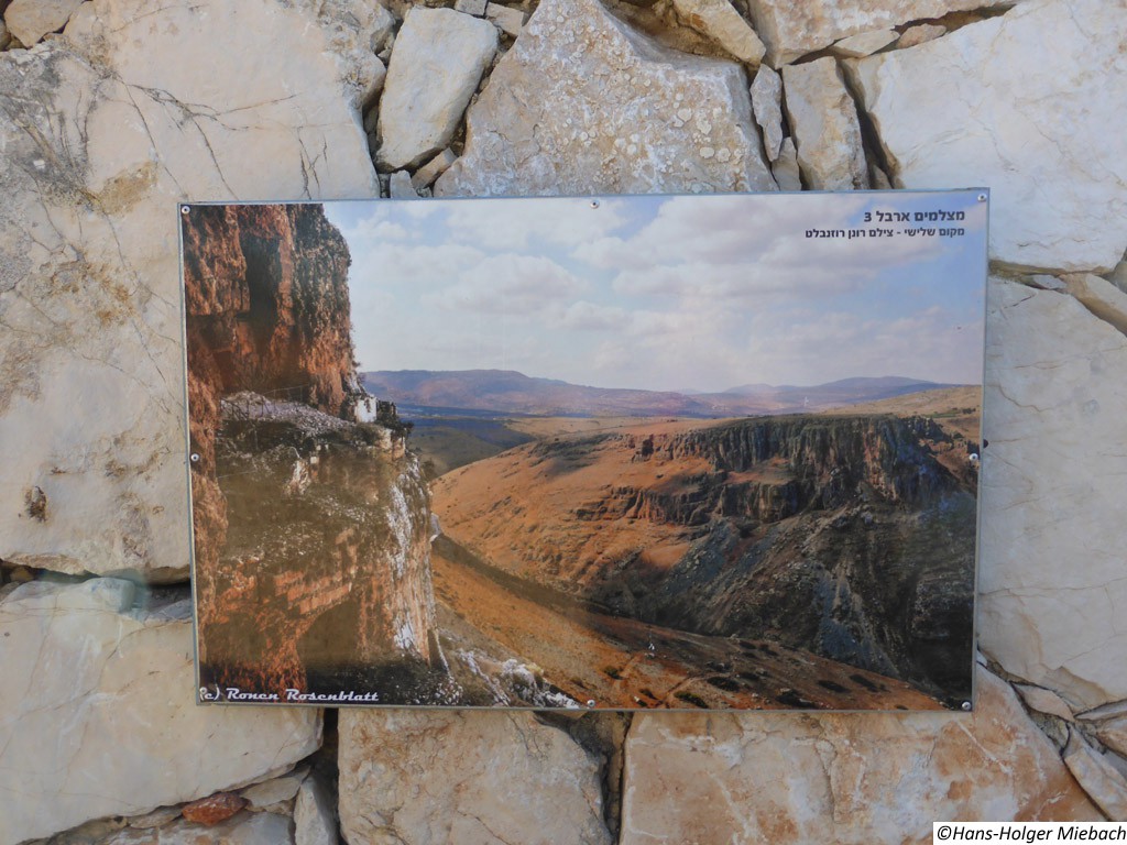 Der Jesus-Pfad ist ein 65 Kilometer langer Wanderweg. Er führt vom Stadtzentrum Nazareths über den Berg Tabor bis nach Kapernaumvon. Dieser Weg verläuft auch über die Klippen von Arbel, von denen sich ein traumhafter Blick auf den See Genezareth eröffnet. In den Höhlen unter den Klippen verschanzten sich einst Rebellen vor den Schergen des Herodes. Biblische Bezüge: Jesus persönlich soll hier vor mehr als 2000 Jahren auf dem Weg nach Kapernaum die Klippen von Arbel hochgeklettert sein, um von Nazareth nach Kapernaum zu gelangen. Das Hintergrundbild zeigt den See Genezareth, vom Arbel aus gesehen. |