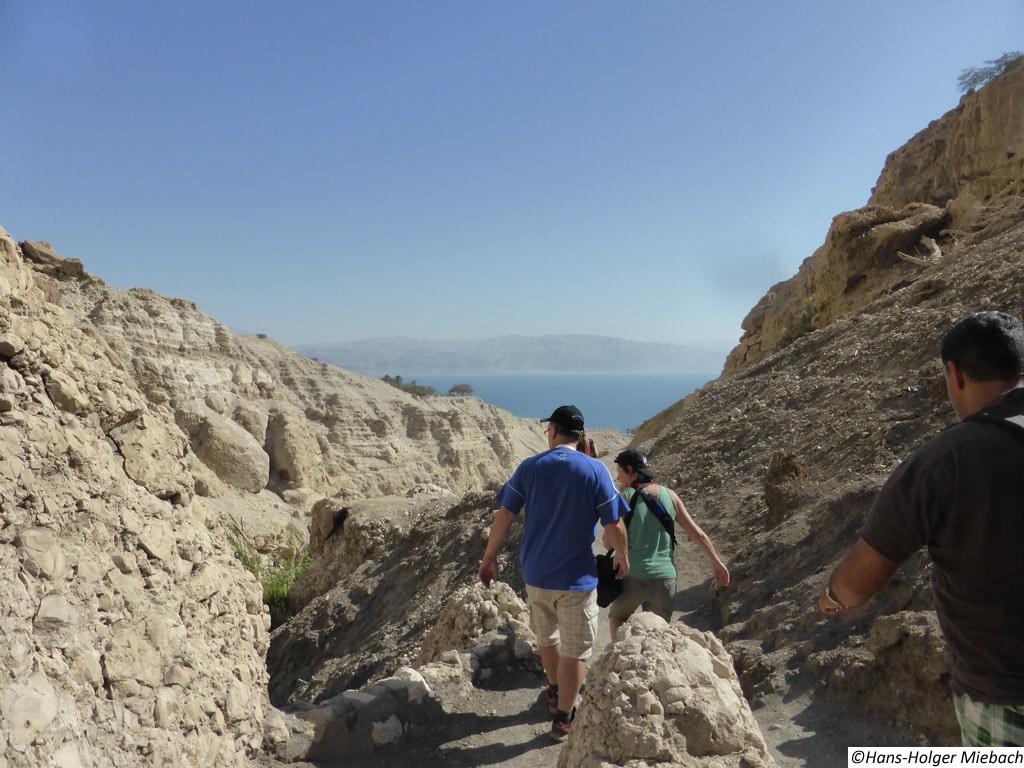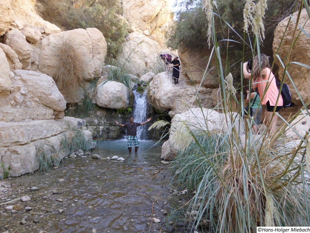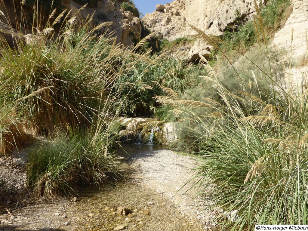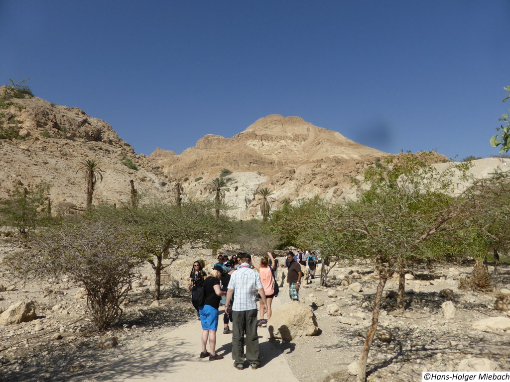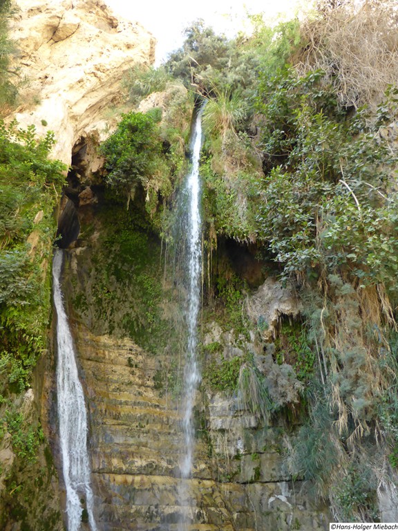 En Gedi oder Wadi David ist eine wasserreiche Oase im nördlichen Teil der israelischen Wüste Negev. Sie liegt am Westufer des Toten Meeres, nur wenige Kilometer südlich der Grenze zum Westjordanland. Biblische Bezüge: Die Felsen von En Gedi sind reich an geräumigen Höhlen. In einer dieser Höhlen könnten sich König David und seine Männer versteckt haben (1.Samuel 24,1-2). Das Hintergrundbild zeigt die Felsen von En Gedi. |