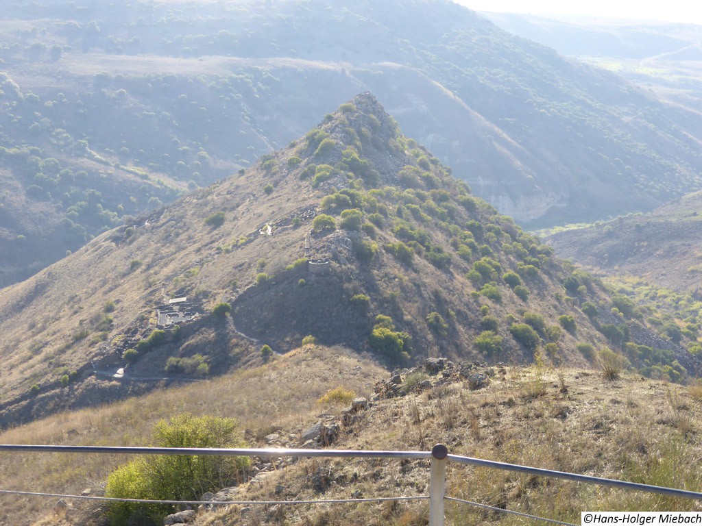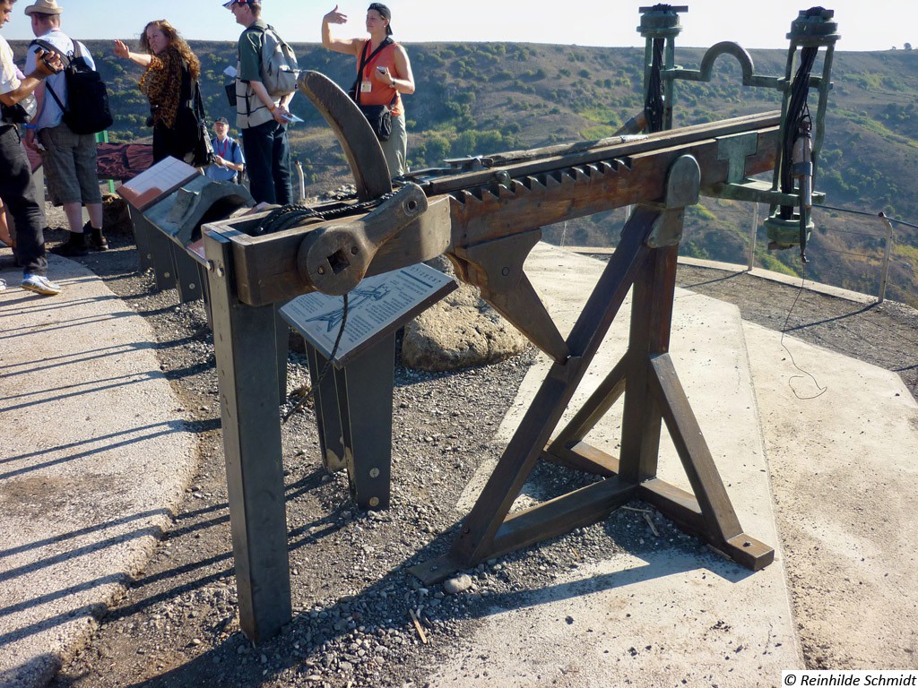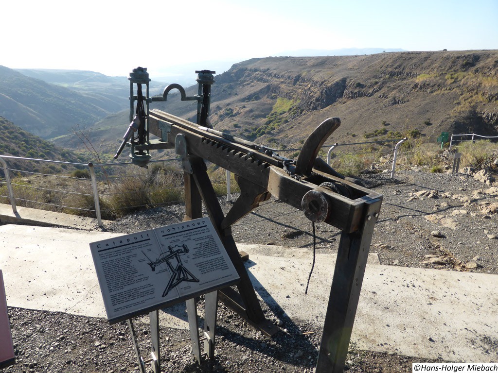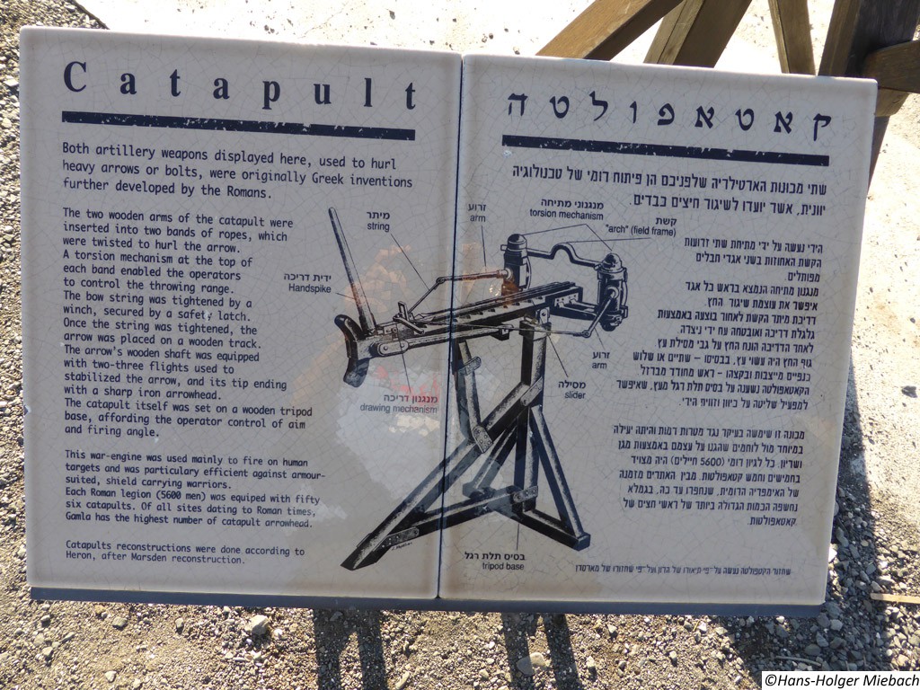 Gamla war eine alte jüdische Stadt auf den Golan-Höhen. Während des großen jüdischen Kriegs leistete die Stadt den erbitterten Widerstand gegen die Römer. Erst im Winter 67 n. Chr. nach längerer Belagerung fiel sie in die Hände der Römer. Die römischen Truppen zerstörten und plünderten die Stadt vollständig. Sie wurde nie mehr aufgebaut und wurde vergessen. Erst nach dem Sechstagekrieg wurden die Ruinen der Stadt wiederentdeckt. Wegen des Widerstandes gegen die Römer ist Gamla ("Masada des Nordens") ein Symbol des Heldentums für den modernen Staat Israel. Sie ist auch ein wichtiger historischer und archäologischer Standort. Gomla liegt innerhalb des gegenwärtigen Gamla Naturschutzgebiets und ist eine bedeutende Touristenattraktion. Die Stadt verfügte über eine großräumige Synagoge. Das Hintergrundbild zeigt den Nachbau eines römischen Katapultgeschosses. |