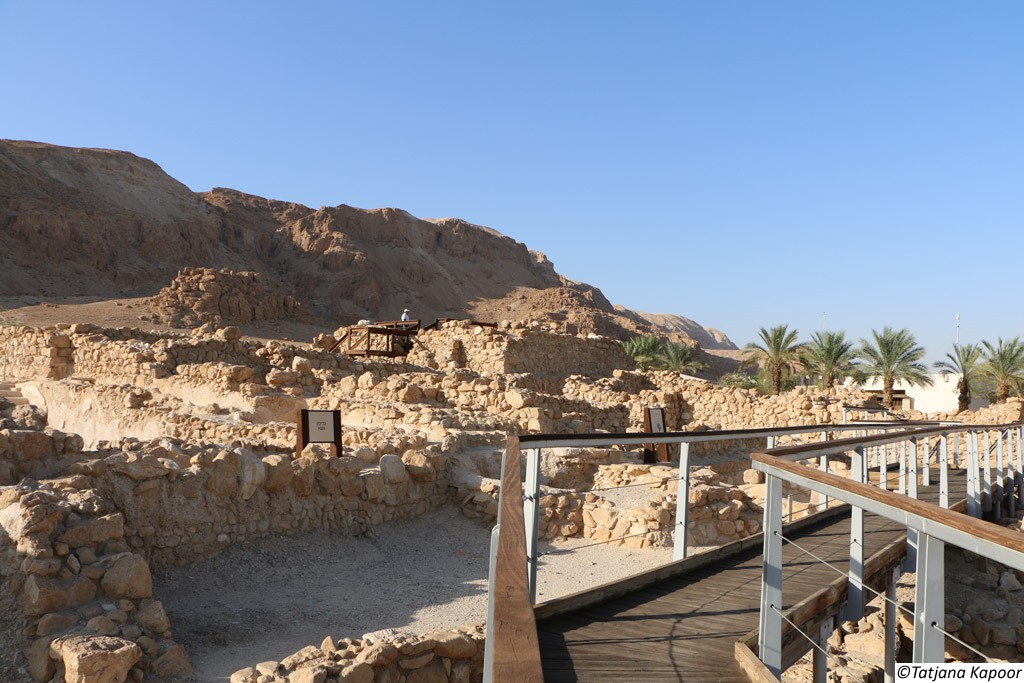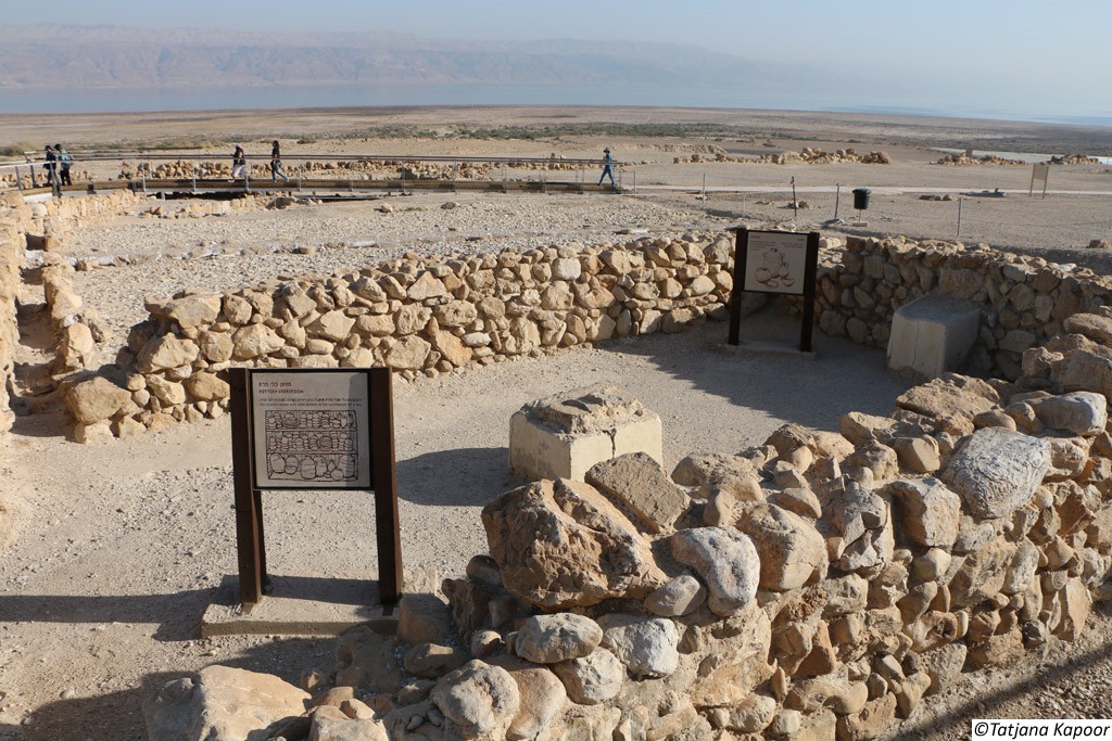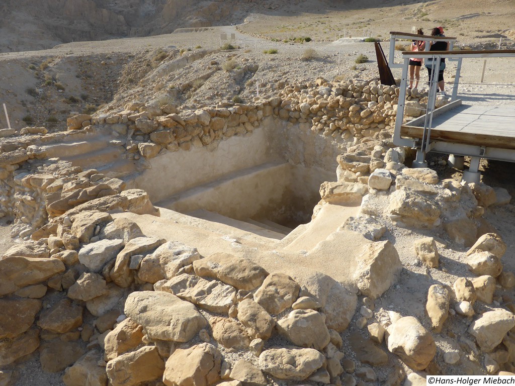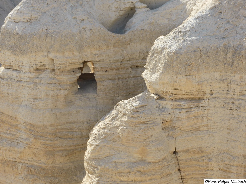 Qumran ist eine antike Siedlung, die in Ruinen erhalten ist. Sie liegt auf einer flachen Mergelterrasse nahe dem Nordwestufer des Toten Meeres. Sie wurde 68 n. Chr. während des jüdischen Aufstands gegen die Römer (66–70) von diesen zerstört. Die Höhlen in der näheren Umgebung sind durchnummeriert. Die Höhlen 4, 5 und 7 - 10 liegen in Sichtweite zur Siedlung. In Höhle 4 wurden Reste von rund 600 Schriftrollen gefunden, darunter auch die Jesaja-Rolle, die im 2. Jahrundert v. Chr. erstellt wurde. Diese enthält Prophezeiungen über Jesus Christus (Jesaja 53 und Jesaja 7,14). Das Hintergrundbild zeigt Qumran-Felsen. |